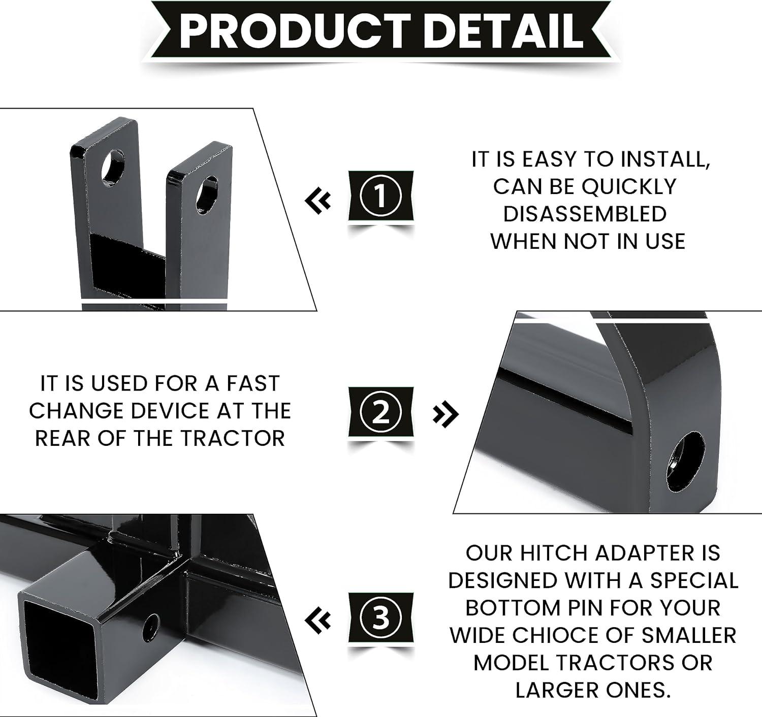 FEATURE: Our hitch adapter is designed with a special bottom pin for your wide chioce of smaller model tractors or larger ones. Additionally, The hook is made of a high-quality and sturdy triangle design for long-lasting using and relatively light weight.