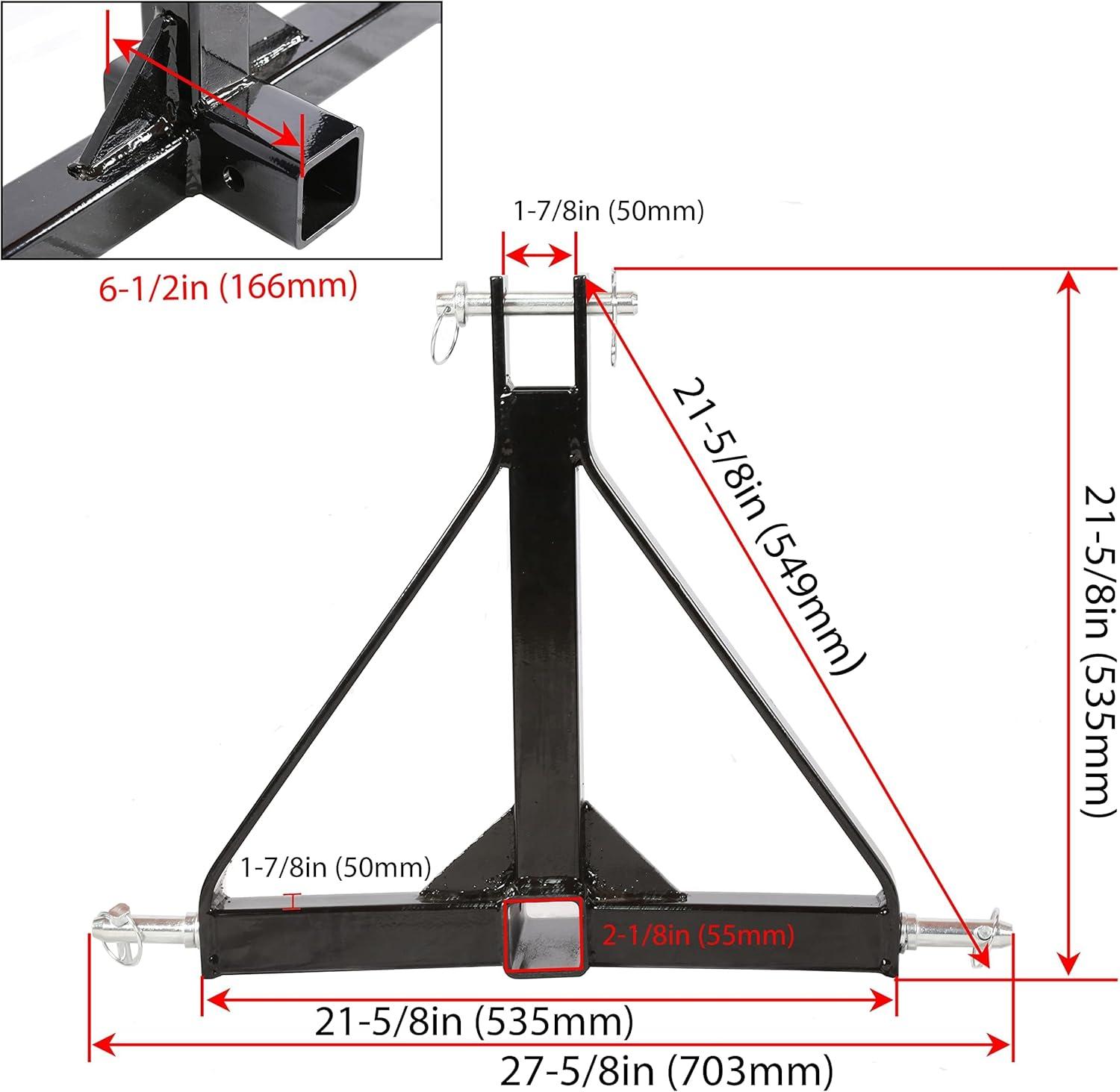 SPECIFICATION: Category 1 lift pins (7/8″ diameter); Height: 19″ (bottom pin to top pin); Width: 26″(from end of pin);Fit Standard 2″ trailer receiver(Note: will not fit John Deere IMatch).
