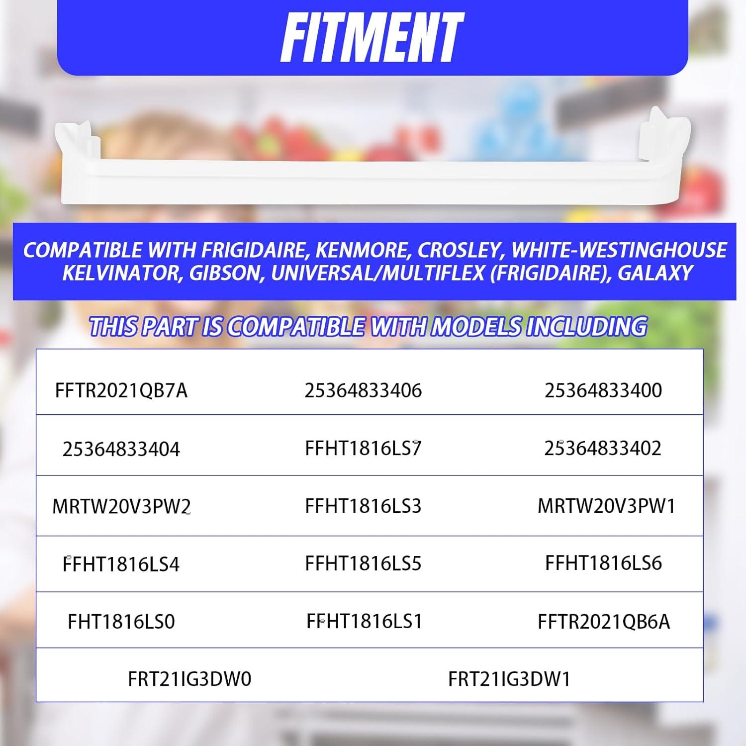 PACKAGE INCLUDING: 1 x Refrigerator Door Shelf.(Hardware not Included – Reuse Factory Hardware.) This part is compatible with models including FFTR2021QB7A, 25364833406, 25364833400, 25364833404, FFHT1816LS7, 25364833402, MRTW20V3PW2, FFHT1816LS3, MRTW20V3PW1, FFHT1816LS4, FFHT1816LS5, FFHT1816LS6, FHT1816LS0, FFHT1816LS1, FFTR2021QB6A, FRT21IG3DW0, FRT21IG3DW1.