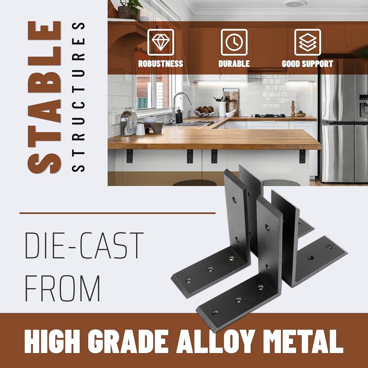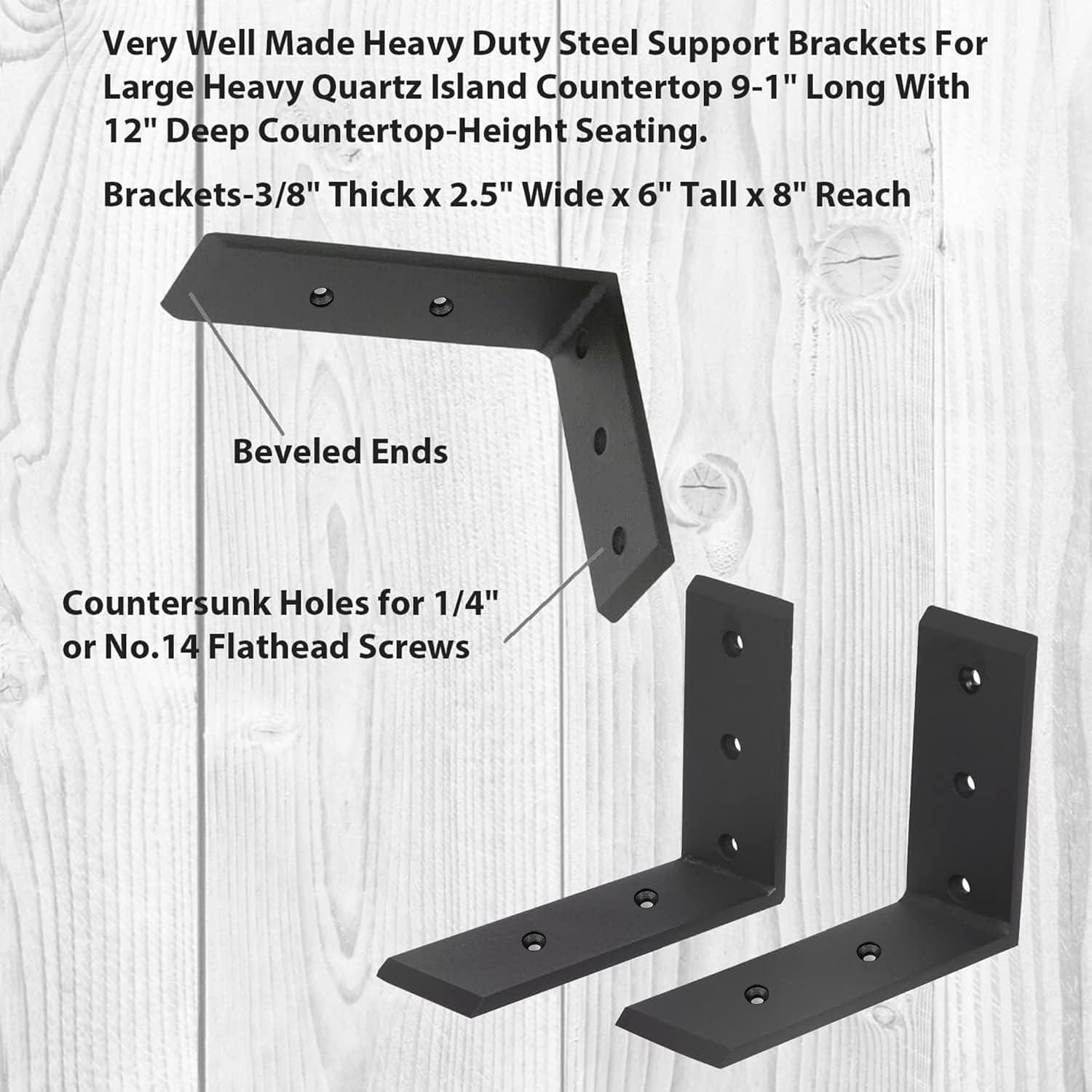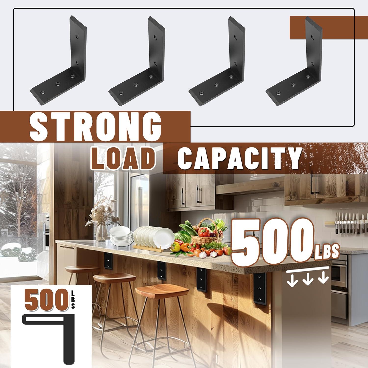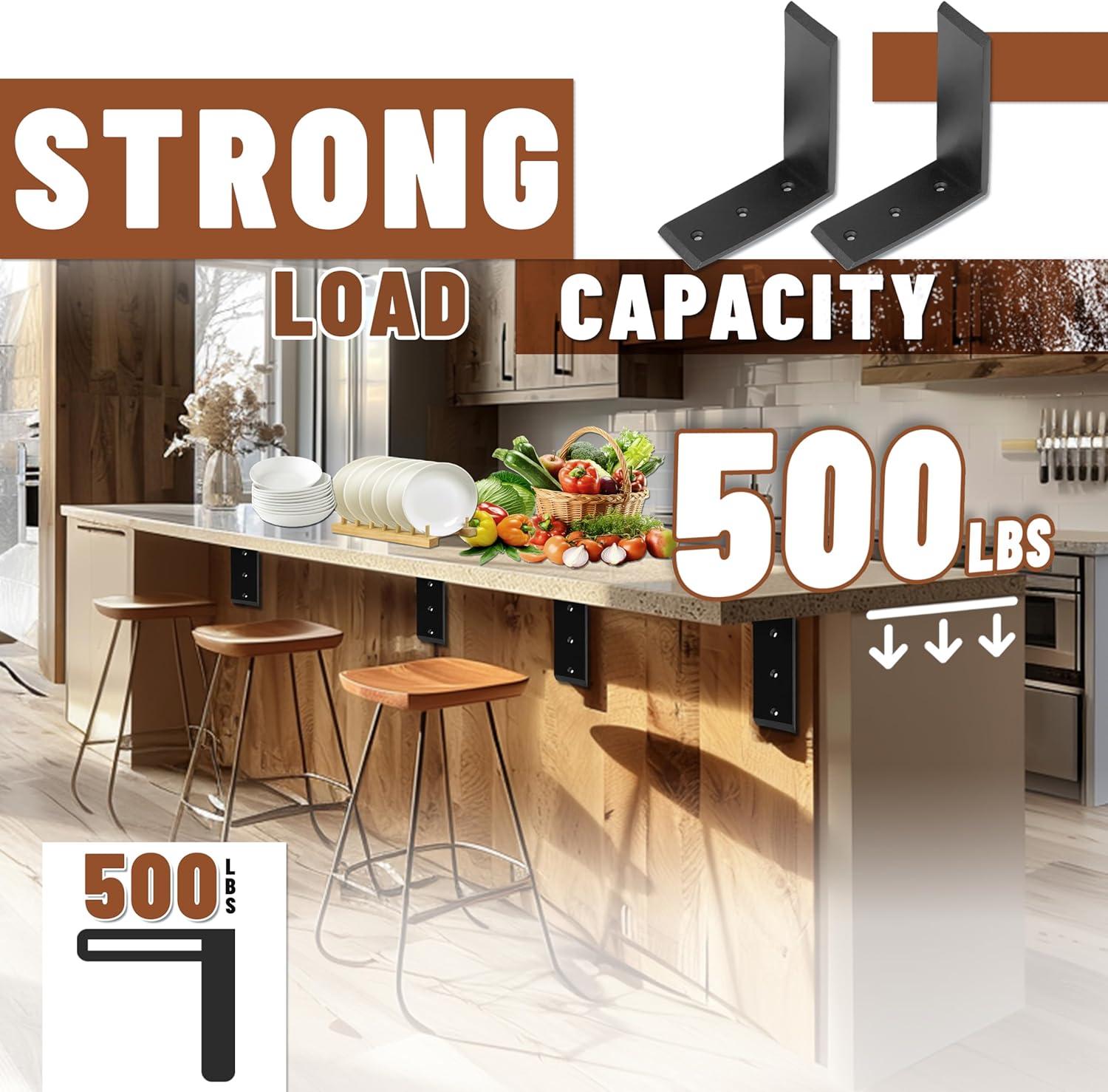 High Performance: Made of durable steel, it can stably support all kinds of heavy items, such as kitchen countertops and storage racks. No matter how many items you put, you can rest assured that you can rely on their strong support. Load: 500 pounds Multifunctional Design: It can meet the needs of different scenes and spaces. Whether it's a small bookshelf, a spacious kitchen countertop or a complicated storage shelf, the support brackets can provide reliable support for it Reliable & Durable: These support frames have been carefully designed and manufactured, with excellent durability and stability. They can withstand the heavy pressure brought by daily use, and will not be loose or deformed, providing you with lasting support solutions Exact Dimensions: 8″ x 6″ x 2-1/2″ Wide (does not come with screws, please purchase screws according to your requirements). Note that the 8″ side is designed to go under the counter, so your overhang should be between 8.5″ & 12″ Package & Installation: 2 pcs of Countertop Support Brackets. Brackets are pre-drilled for easy installation. They work well in supporting counter tops and many other applications