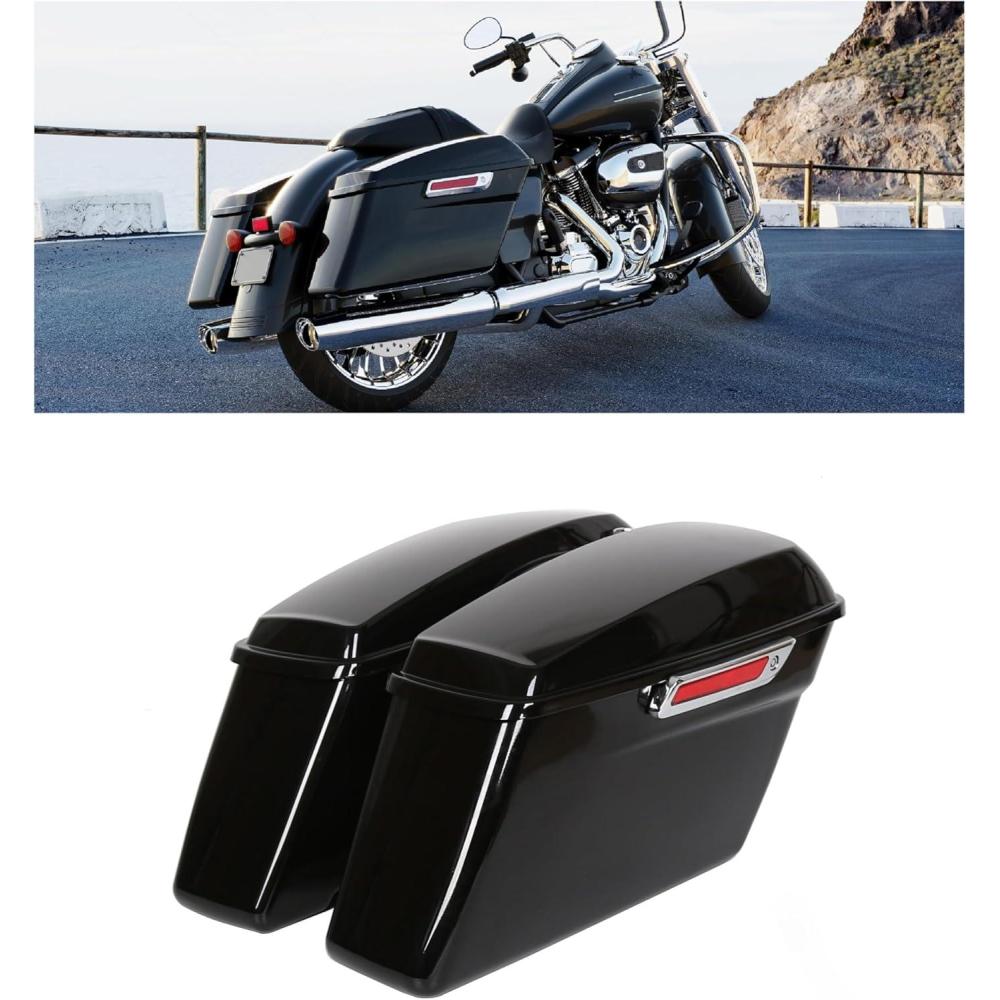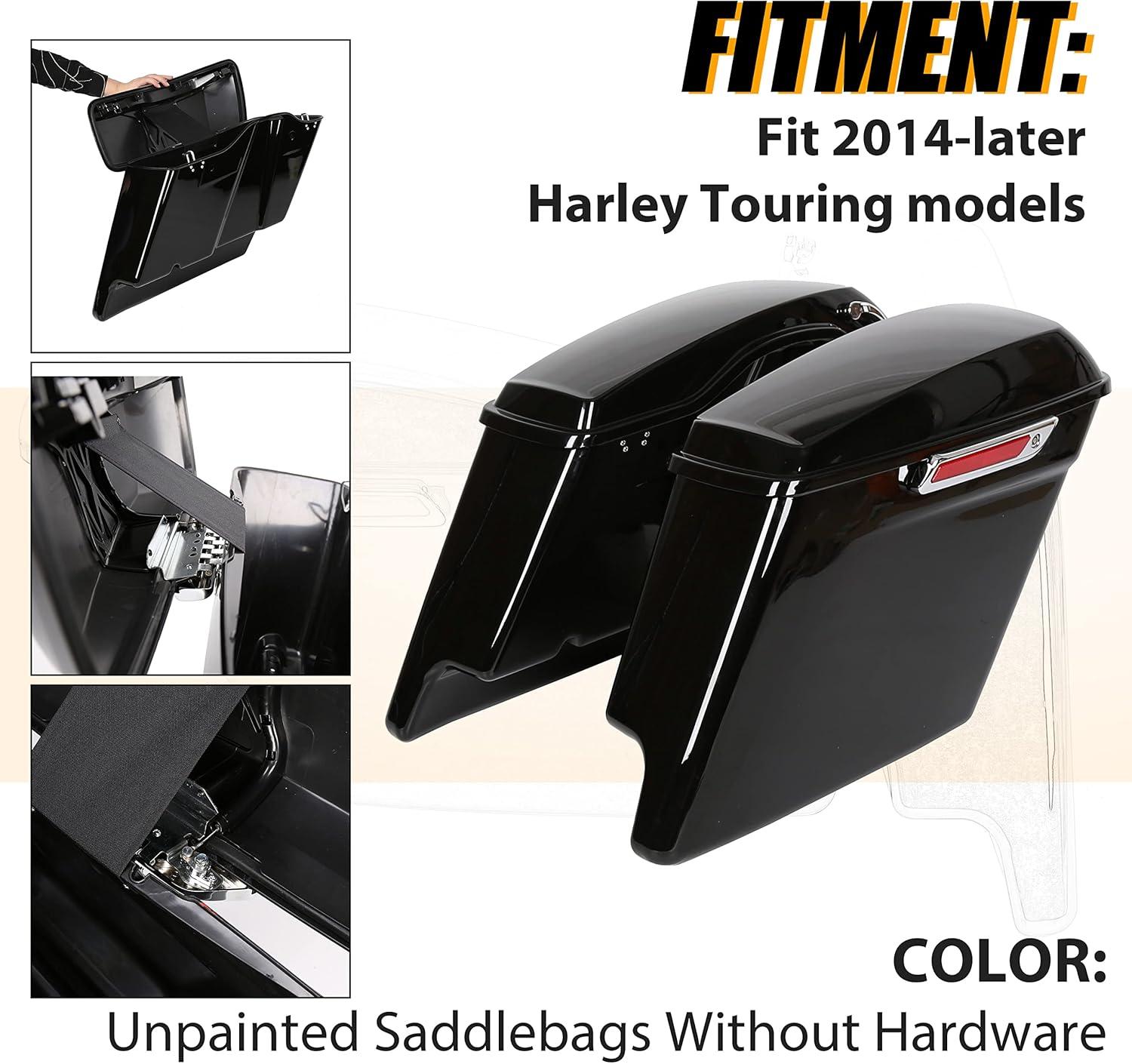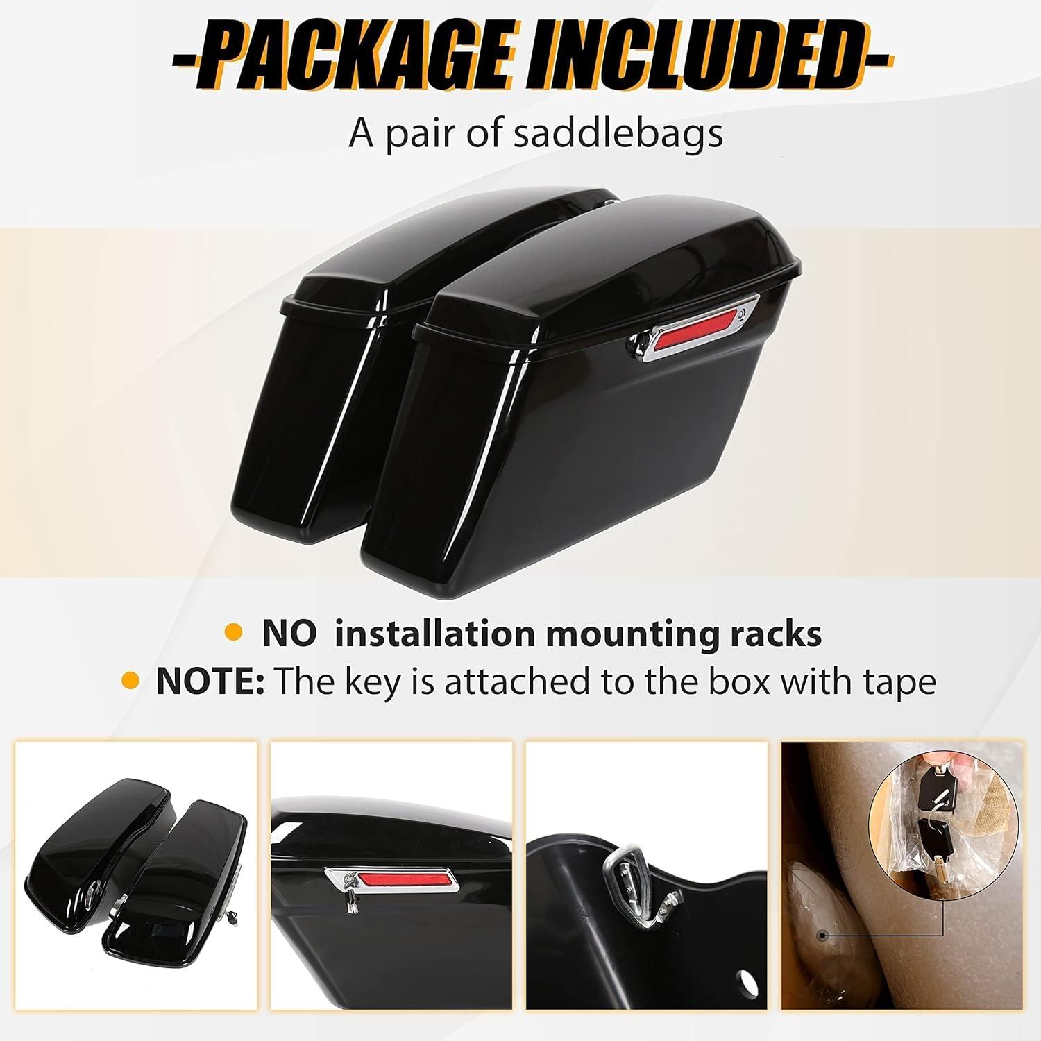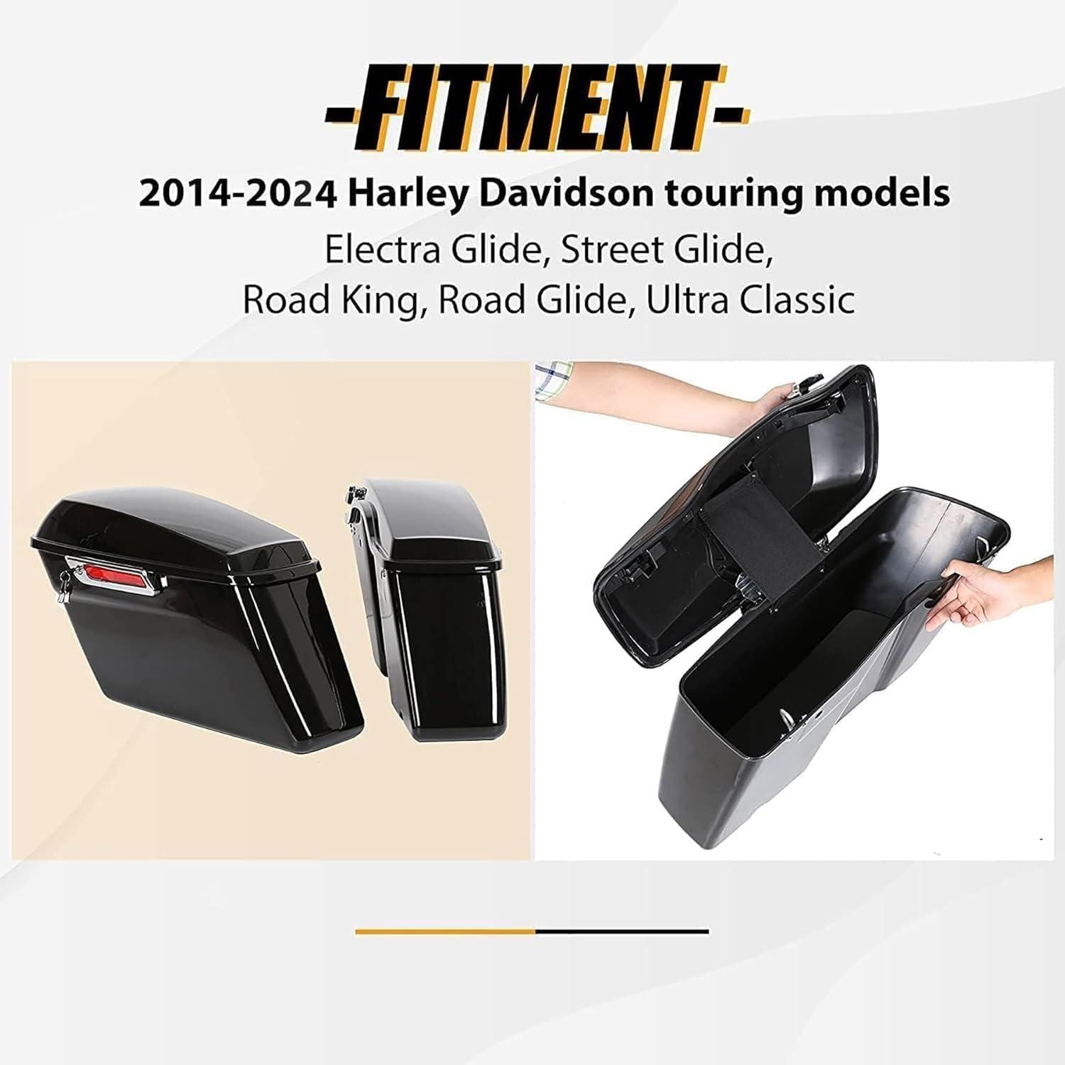 Saddle bag compatible with 2014-2024 Harley Touring models(FLT, FLHT, FLHTCU, FLHRC, Road King, Road Glide, Street Glide, Electra Glide, Ultra-Classic). Package: 1 Pair Left & Right Saddlebag W/ Latch, Lock & 2 Keys. Note: The key is attached to the box with tape.