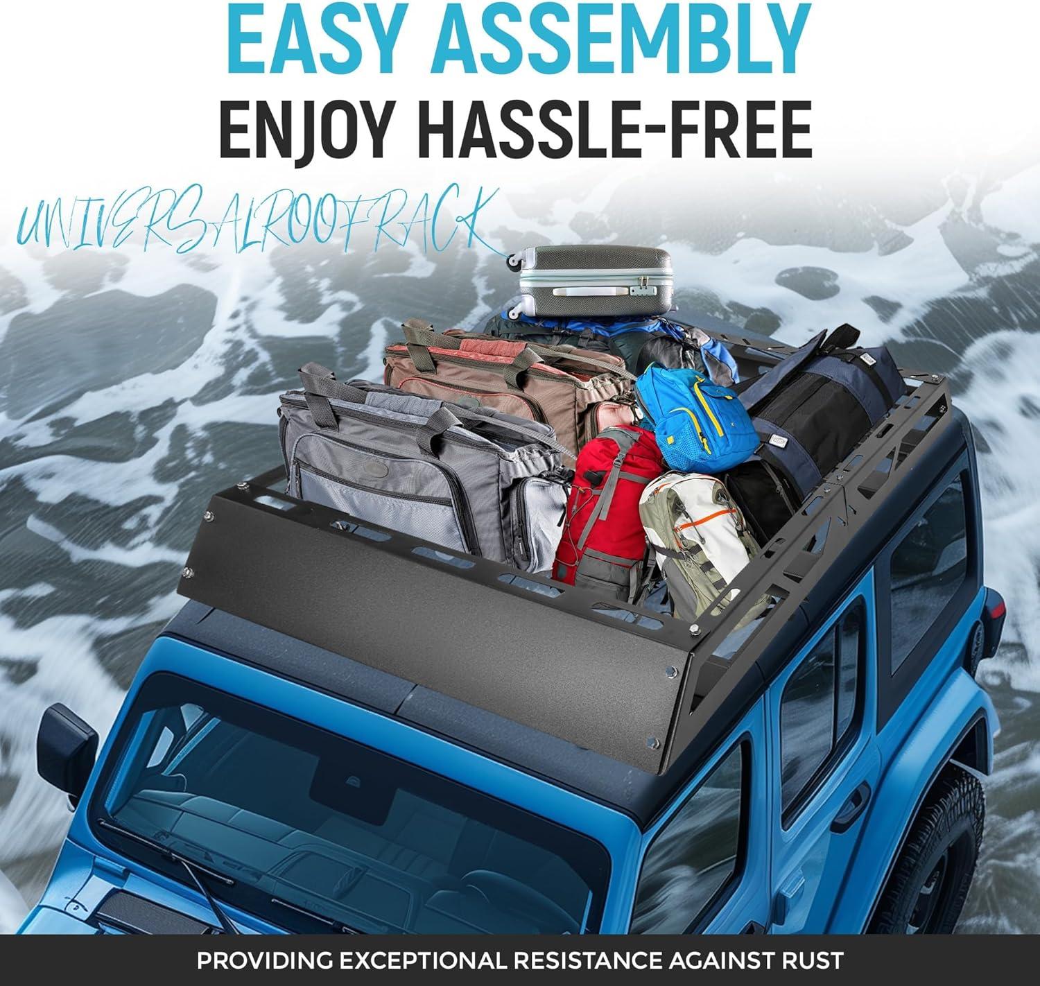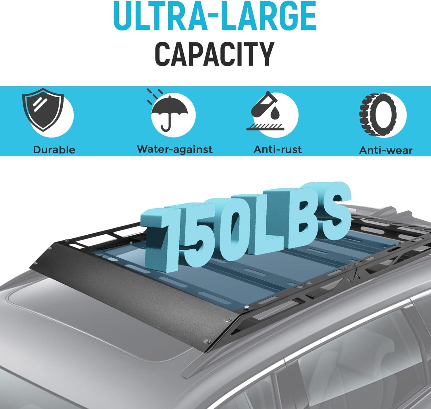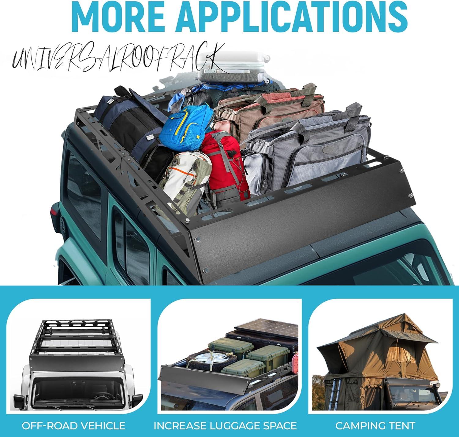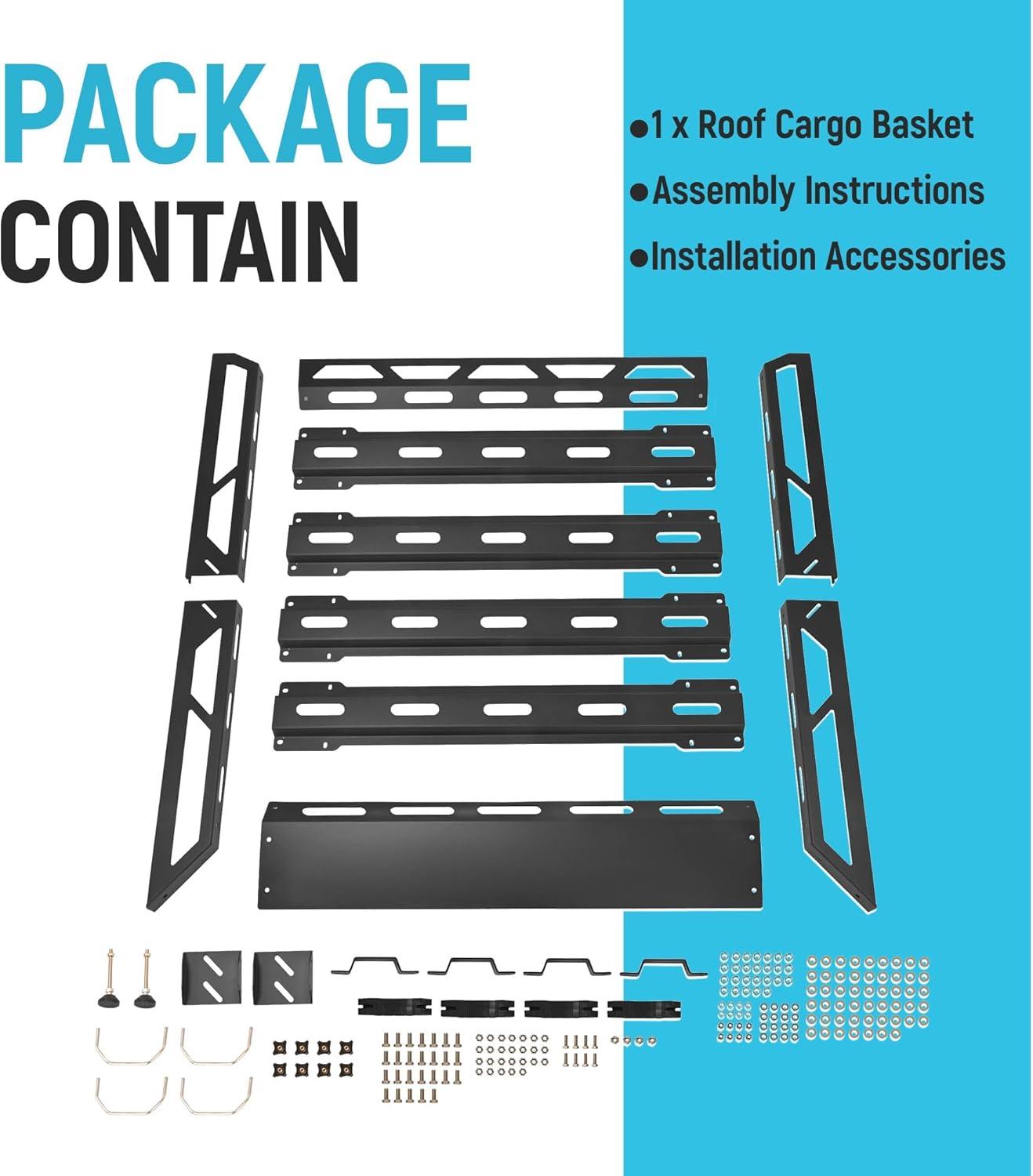 Useful function: Use this roof rack to store hauling extra luggage, camping equipment, cargo bags and more. Built for the outdoor adventurers lifestyle. Easy to install with 4 universal U-bolts. The bottom metal bars and side rails provide plenty of tie down points. A steel wind fairing is also included. Carry big loads and mount accessories directly to the crossbars or straight bars of this roof rack cargo basket