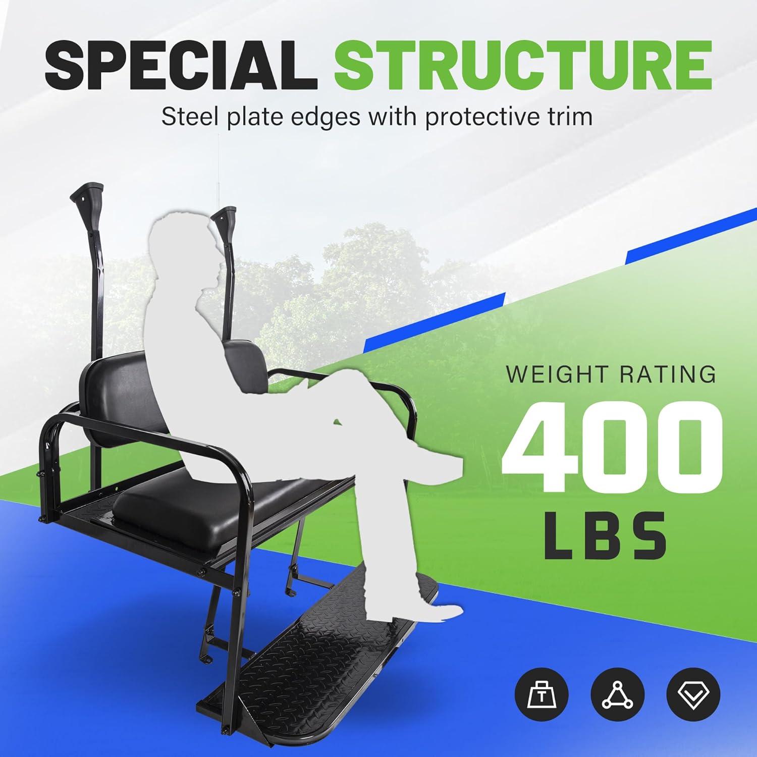 FOLD-DOWN CARGO BED – You can quickly fold the golf cart's back seat into a convenient cargo box. Meanwhile, 360 degree bed rails can keep your goods in place when it moves. Cargo bed Carry load weight rating 400 lbs.