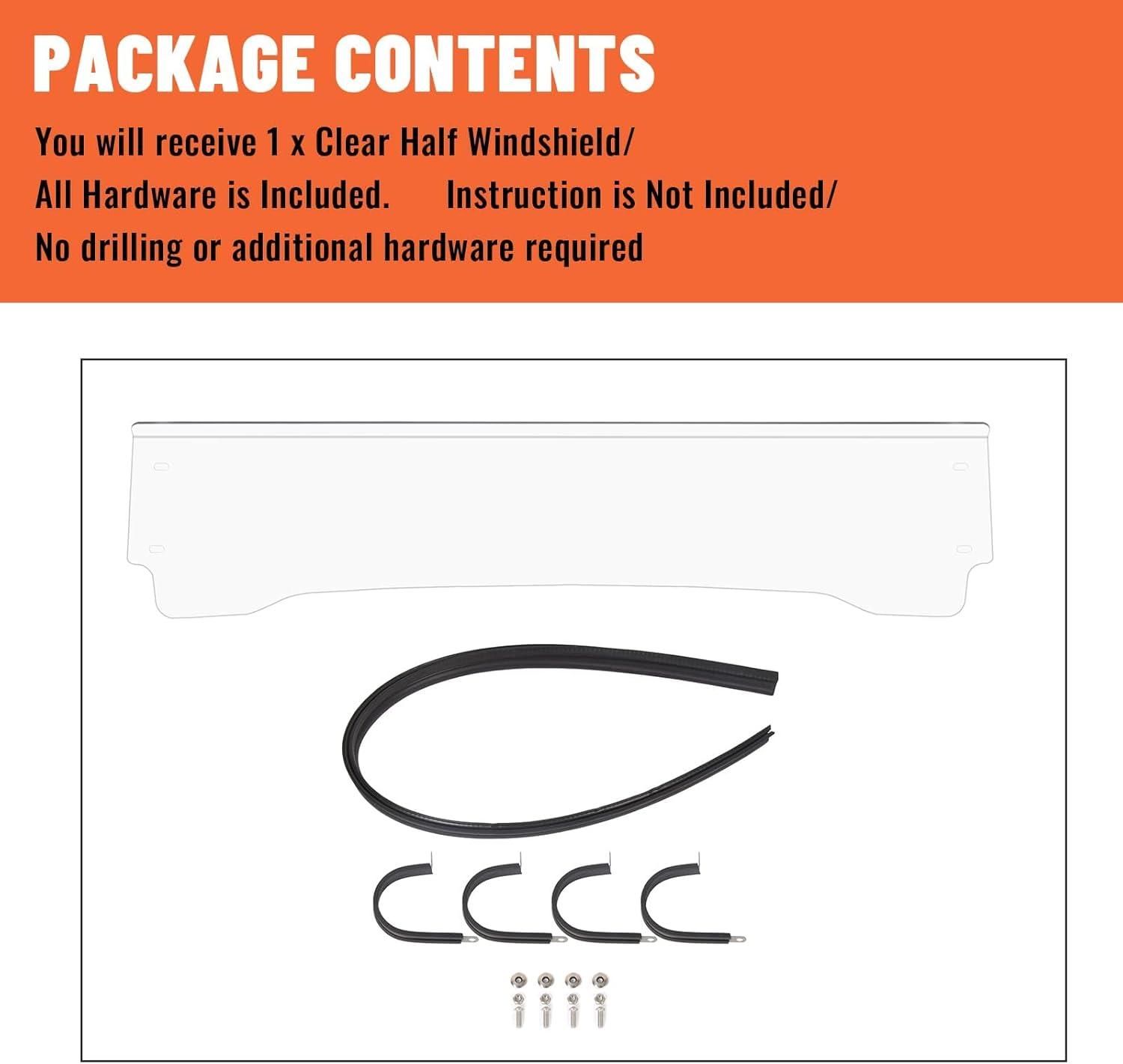 EASY INSTALLATIONY- ou can install the half windshield in minutes just using our heavy-duty straps. All Hardware is Included. No drilling or additional hardware required. Instruction is Not Included.