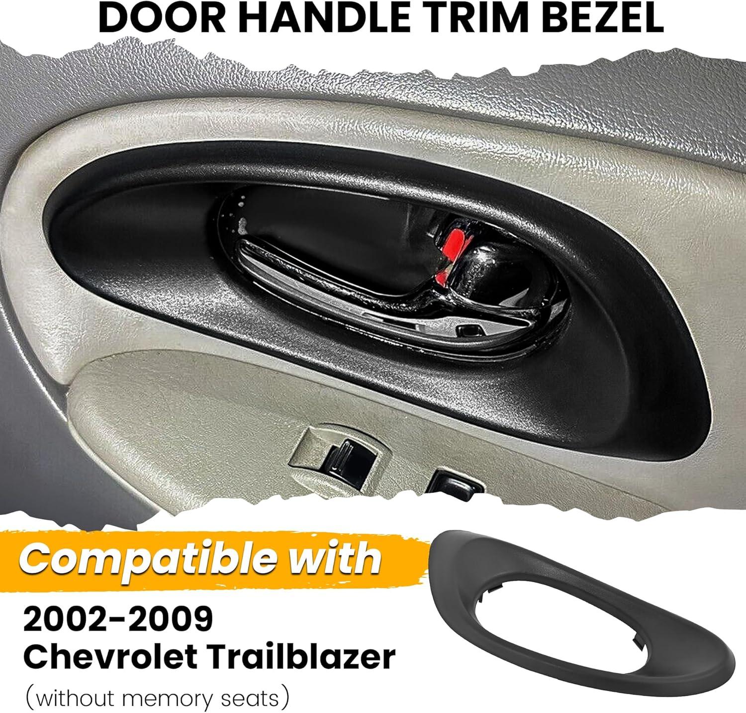 Compatible with 2002 2003 2004 2005 2006 2007 2008 2009 Chevrolet Trailblazer(without memory seats). This NEW Door Handle Trime Bezel is a high quality product to replace your old or damaged factory unit