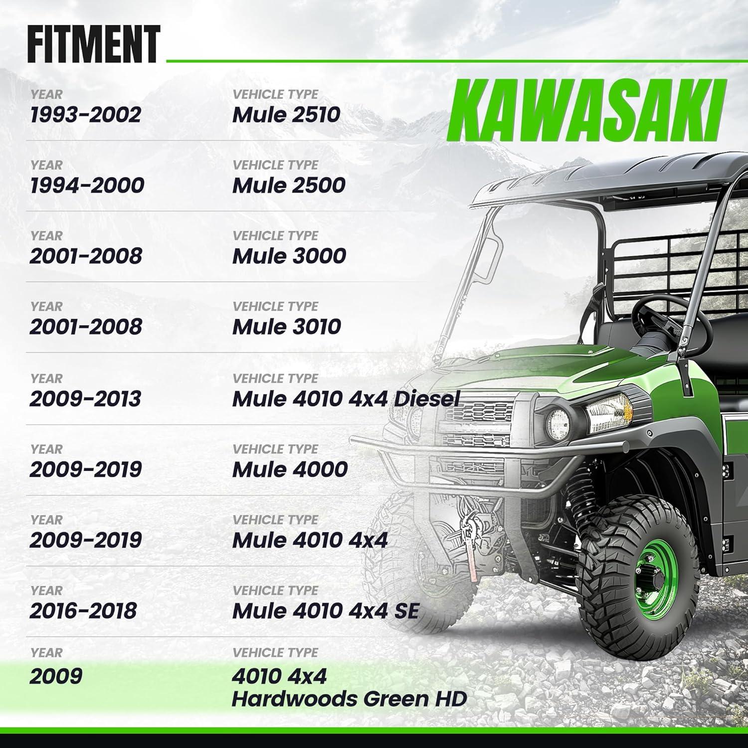 Fitment: Compatible with 1994-2000 Kawasaki Mule 2500 | 1993-2002 Kawasaki Mule 2510 | 2001-2008 Kawasaki Mule 3000 | 2001-2008 Kawasaki Mule 3010 | 2009-2019 Kawasaki Mule 4000 | 2009-2019 Kawasaki Mule 4010 4×4 | 2016-2018 Kawasaki Mule 4010 4×4 SE | 2009-2013 Kawasaki Mule 4010 4×4 Diesel | Compatible with 2009 Kawasaki Mule 4010 4×4 Hardwoods Green HD.