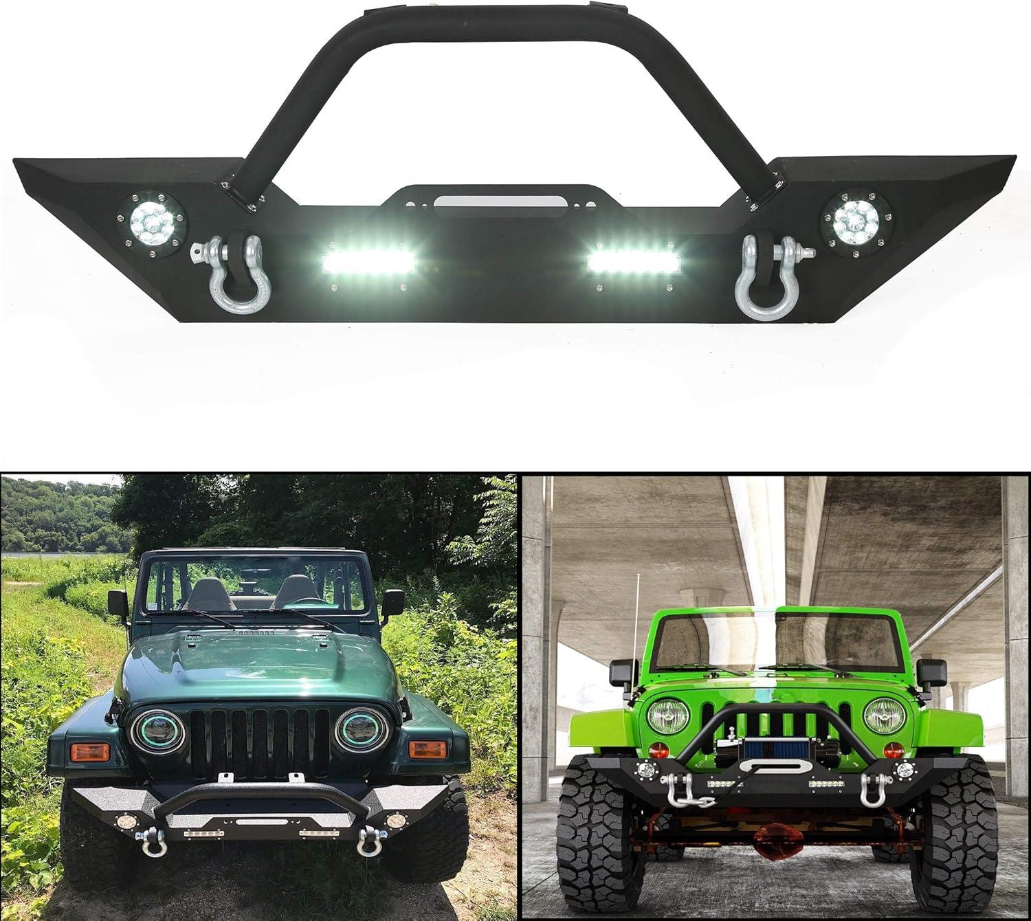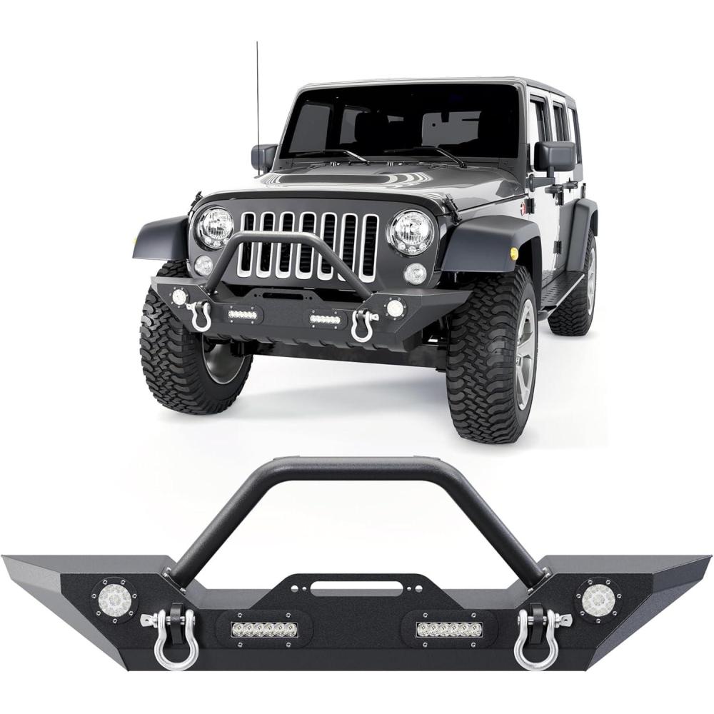 ‎ECOTRIC Front Bumper Compatible with 2007-2025 Wrangler Unlimited JL/JLU & Gladiator JT, 2007-2018 JK Front Bumper Rock Crawler Winch Plate W/Winch Plate & 2 18W LED Lights D-rings(Style2)