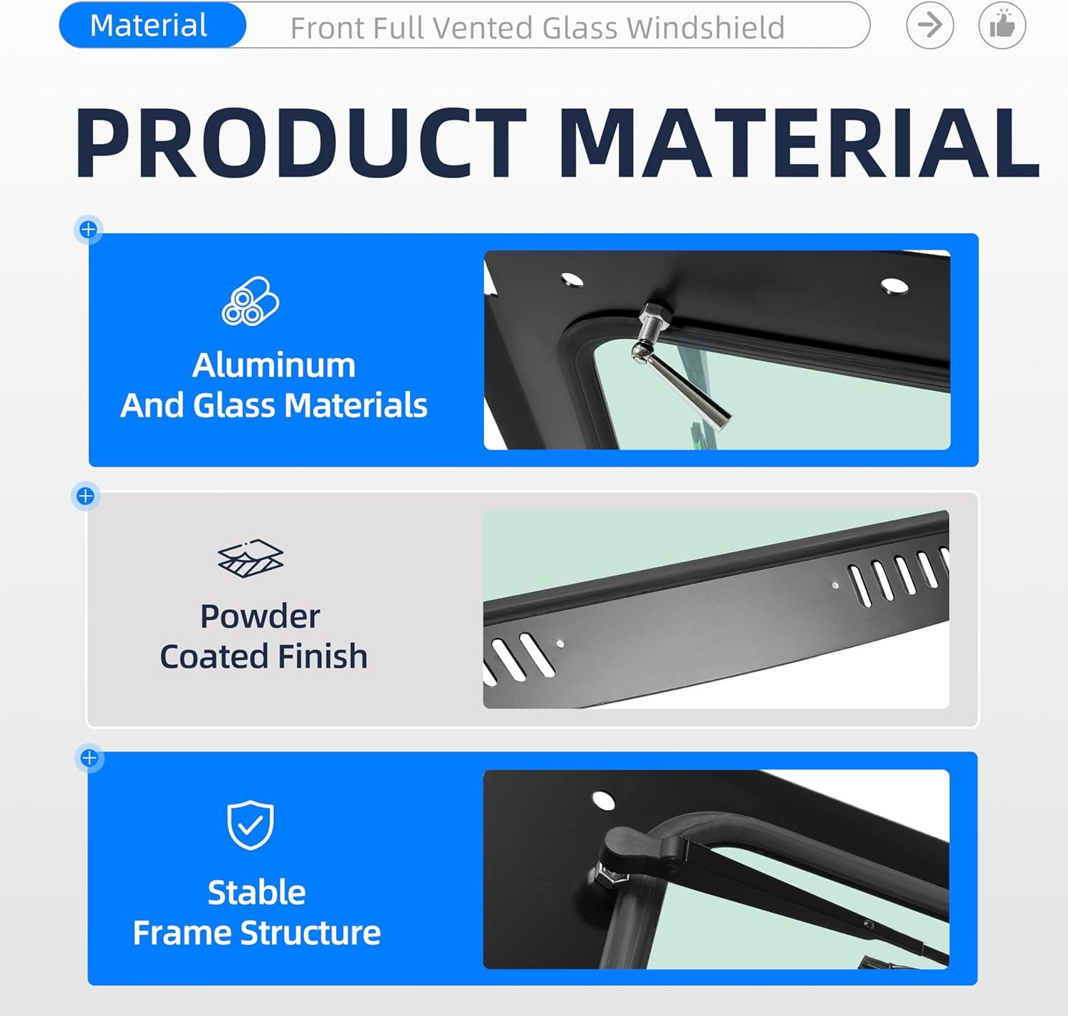 Material: Made of steel and glass, featuring powder coated surface finish, it has good toughness and is not easily broken when subjected to external forces. The front windshield can block debris such as stones, sand and fallen leaves, avoiding them from entering and protecting people from injury