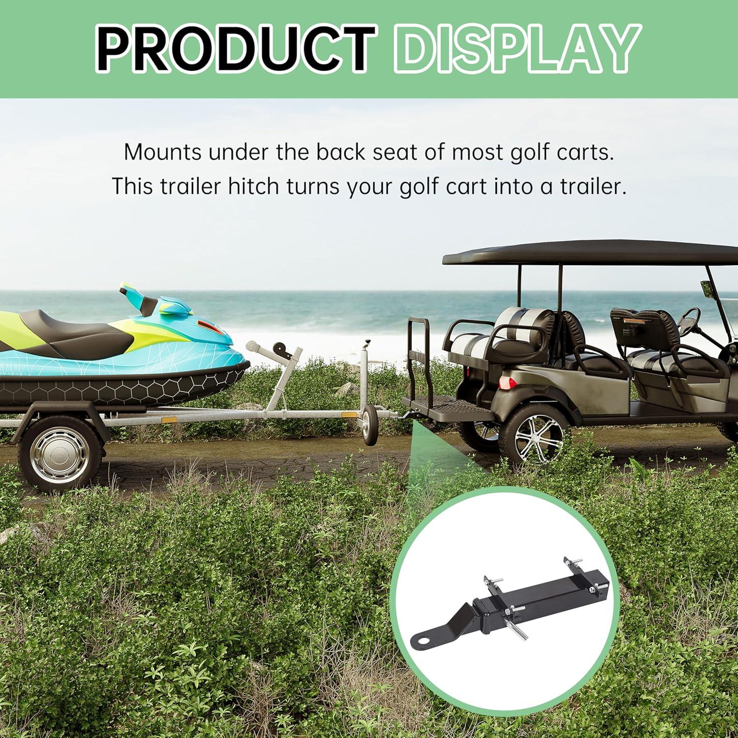 MATERIAL: Made of heavy duty steel for strong load carrying capacity and impact resistance. Black powder coated hitch mounts underneath most golf cart rear seats. This trailer hitch will turn your golf cart into a towing machine.