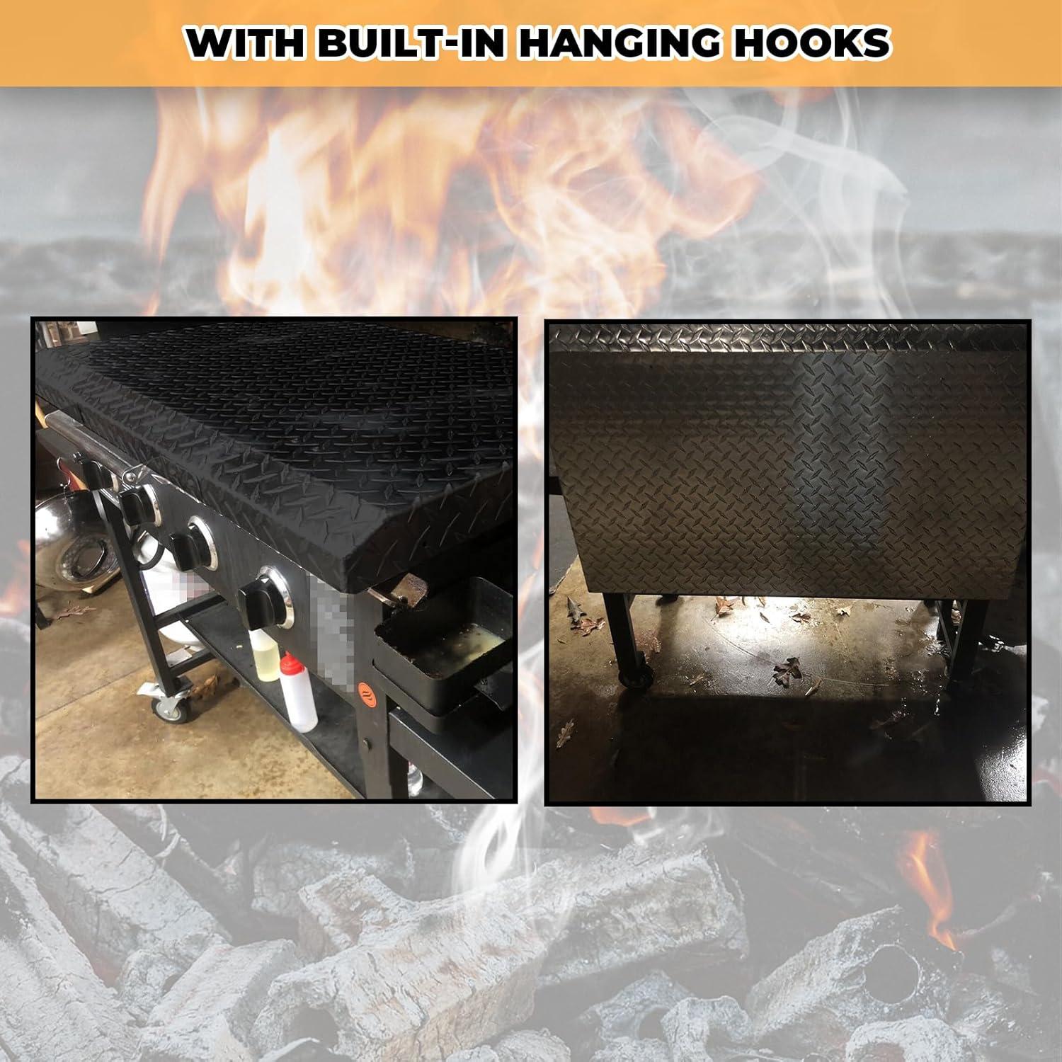 Portable Design – Suitcase Handle Design makes it easy to take off. With built-in hanging hooks, the grill cover can be hung in the back of the griddle when it being used.