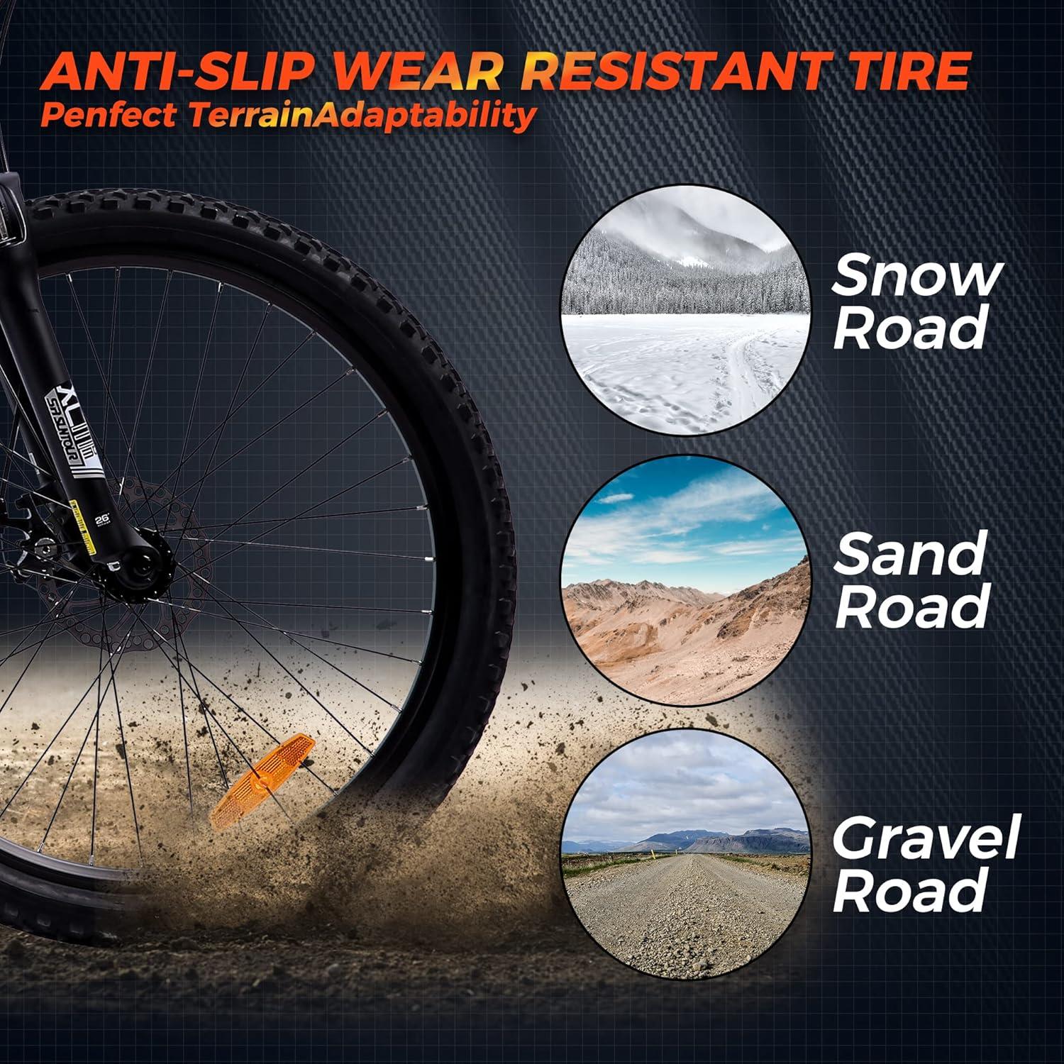 4 WORKING MODES – A powerful and cost-effective mountain e bike. 1. Pedal Assist Mode: The electric mountain bike start with a moderate amount of power as you pedal it. 2. Fully Electric Mode: Twist the throttle in any increments of power you desire to power the motor of the bicycle. 3. Pedal Mode: Pedal the ebike normally as you would any bicycle. 4. Booster Mode: The Ebike will travel at 6 km/ h (3.73 MPH), easy to push.