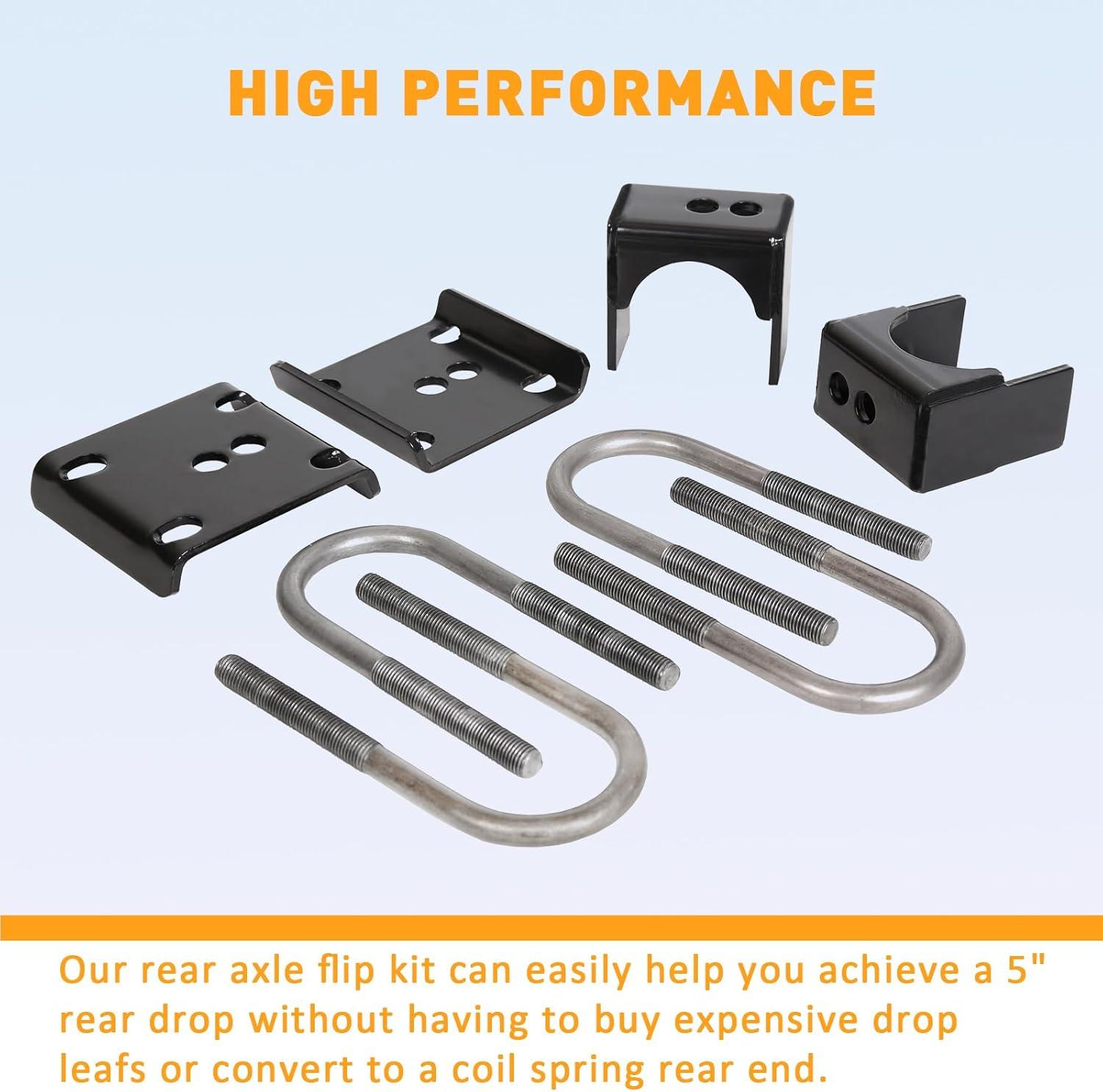Function: Our rear axle flip kit can easily help you achieve a 5″ rear drop without having to buy expensive drop leafs or convert to a coil spring rear end.