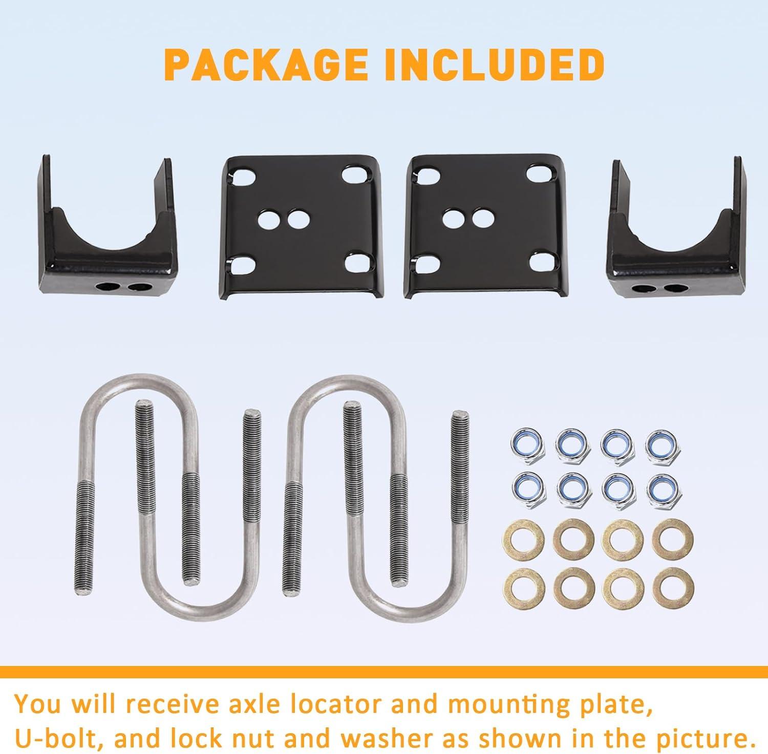 Package Includes: You will receive axle locator and mounting plate, U-bolt, and lock nut and washer as shown in the picture.