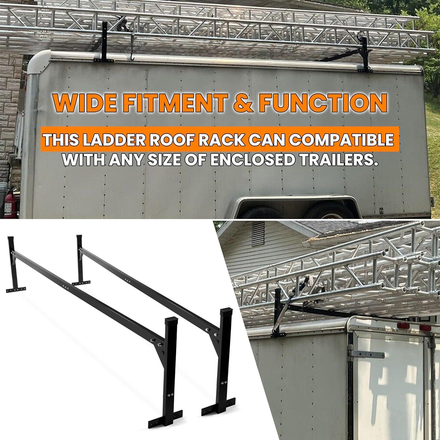 Wide Fitment & Function: This ladder roof rack can compatible with any size of enclosed trailers. It will prevent your belongings from sliding off, such as ladders, lumber, pipes, and other long materials